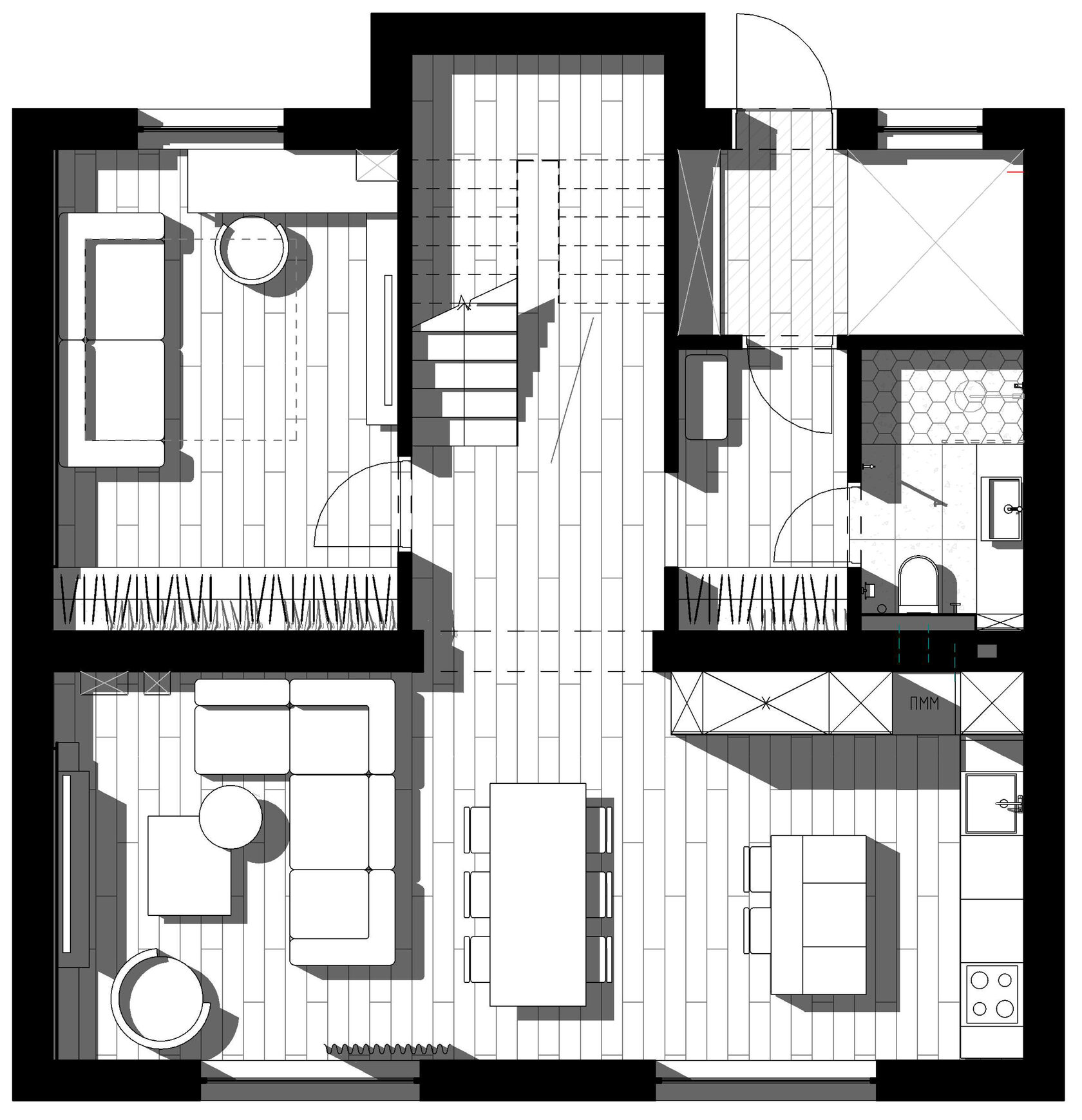 Наш новый проект создавался для молодой семьи с двумя детьми. Семья давно мечтала о своем доме, современном и функциональном. За основу интерьера взяты темные сложные оттенки в сочетании с натуральной фактурой дерева, идеальный баланс строгости и натуральности. Мы постарались по максимуму использовать каждый уголок дома: организовали просторную постирочную, вместительные шкафы в детских, удобную гардеробную в спальне, полноценную ванную комнату ванной чашей и душевой на втором этаже и душевую для гостей на первом этаже, а также использовали пространство под лестницей для кладовой.