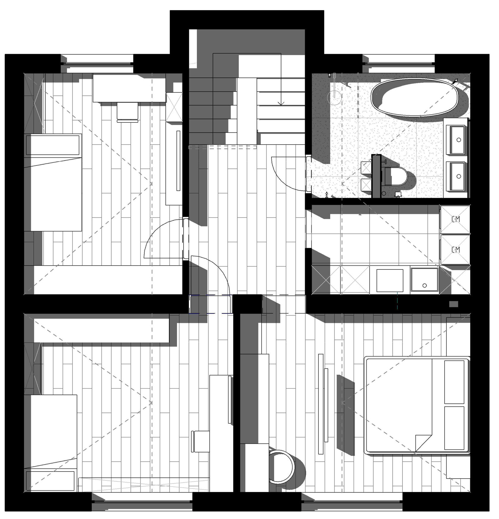 Планировочное решение второго этажа усложнялось тем, что кровля имеет скос и не все решения планировки тут подходят. Но несмотря на это нам удалось грамотно распорядится площадями. Так в спальне родителей мы расположили кровать в самой низкой части, а зону гардеробной расположили при входе, чтобы не пропадало место для хранения. Кроме того мы придумали систему вертикальных плоских реек, расположив их по диагонали к окну, таким образом позволив свету из окна освещать гардеробную зону, но в тоже время лежа на кровати, ты не будешь видеть наполнение гардеробной.