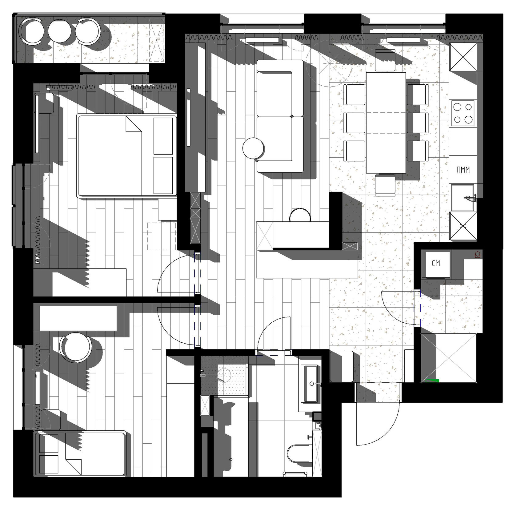 Семья заказчиков очень хотела сделать общее пространство максимально светлым, просторным и наполненным воздухом. Уделить большое внимание функциональности и удобству кухни, так как они очень любят собираться большой дружной компанией и семьей, устраивать вкусные ужины и играть в настольные игры. Данную задачу мы максимально постарались решить с помощью перепланировки, создав пространство без узких коридоров, но не пренебрегая функциональностью.